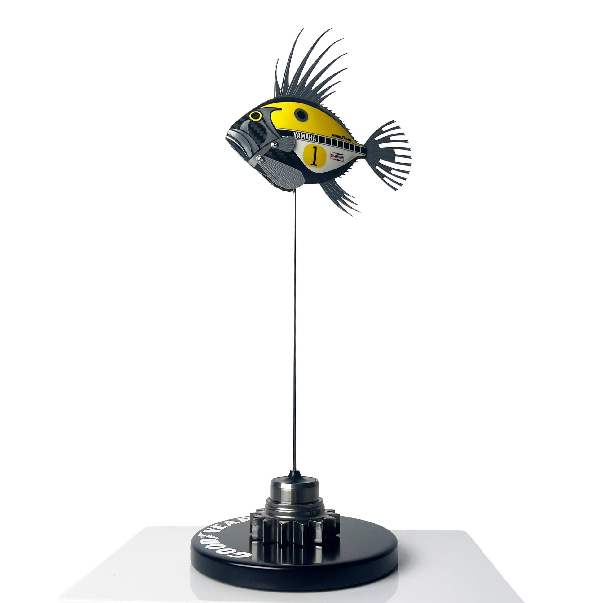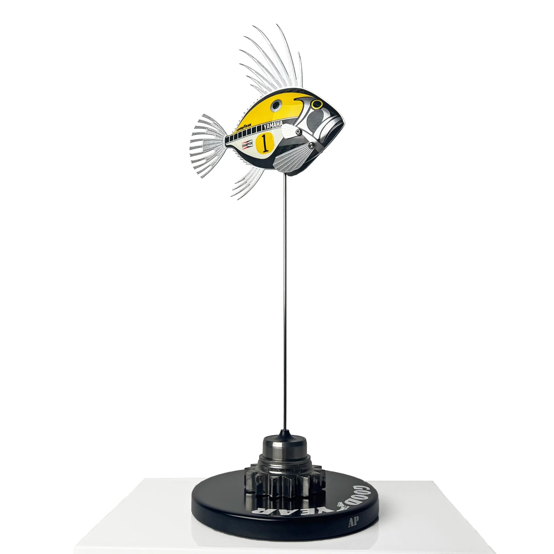 Mounting base and rod: Mounted on a black coated wooden base with Goodyear tyre ID logo and a gear from a modern Formula One GP car.
